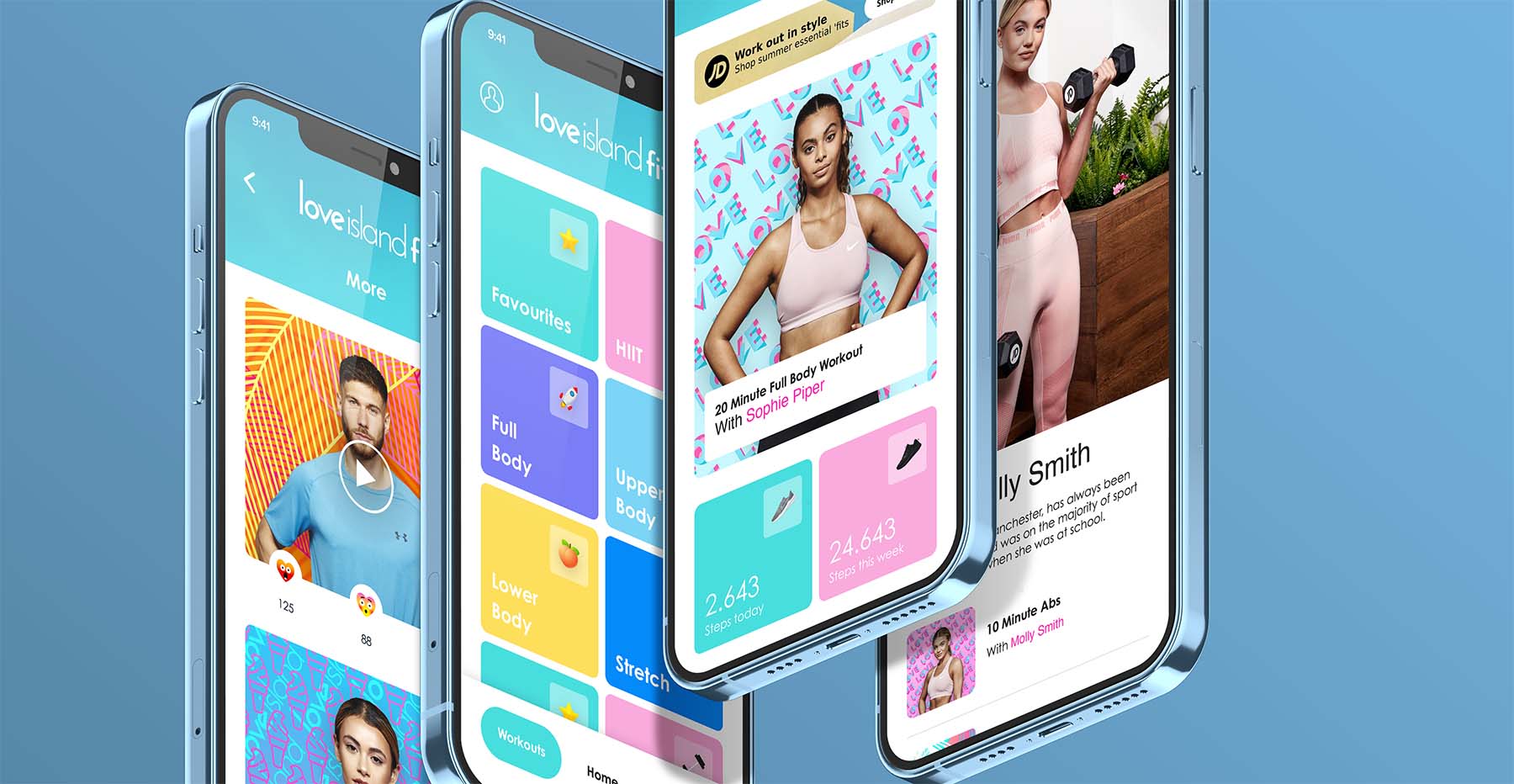 The idea was to create a fun and simple way for fans of the show to train alongside their favourites from the Love Island villa. Throughout the app, there needed to be a clear message about being the best version of “you”, promoting realistic goals and body positivity.